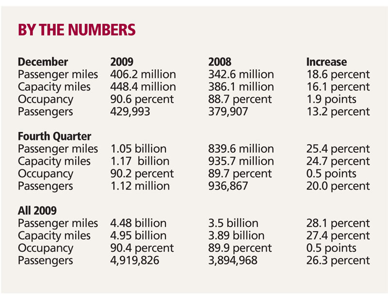 The Las Vegas-based carrier increased its traffic 28.1 percent in 2009 to 4.48 billion passenger miles, even though the company's passenger seat capacity increased 27.4 percent.