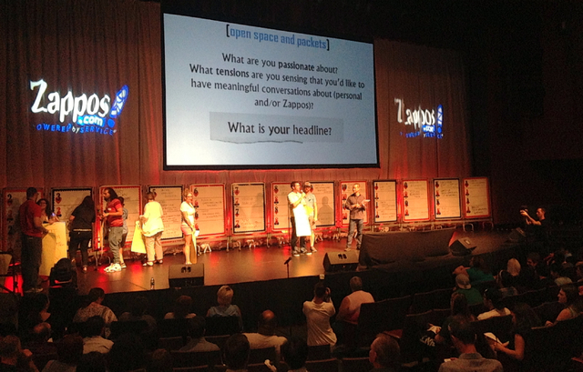 The Zappos quarterly “all hands” meeting ended just before 4:30 p.m. with CEO Tony Hsieh telling the 52 workers brave enough to lead various “Open Space” chat sessions that they could keep the company laptops they used to take notes.