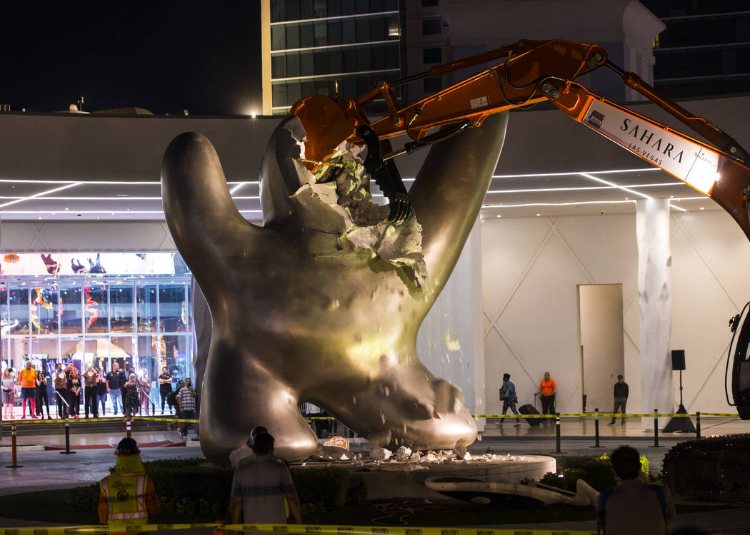 The SLS Las Vegas, which debuted in 2014 as the renovated former Sahara, officially changed its name Thursday to Sahara Las Vegas. If there was any confusion about owner Alex Meruelo’s break with the recent past, work crews Tuesday night demolished the “Sam by Starck” statue out front, tearing down an homage to former SLS owner Sam Nazarian in a spectacle featuring some fireworks and flames.