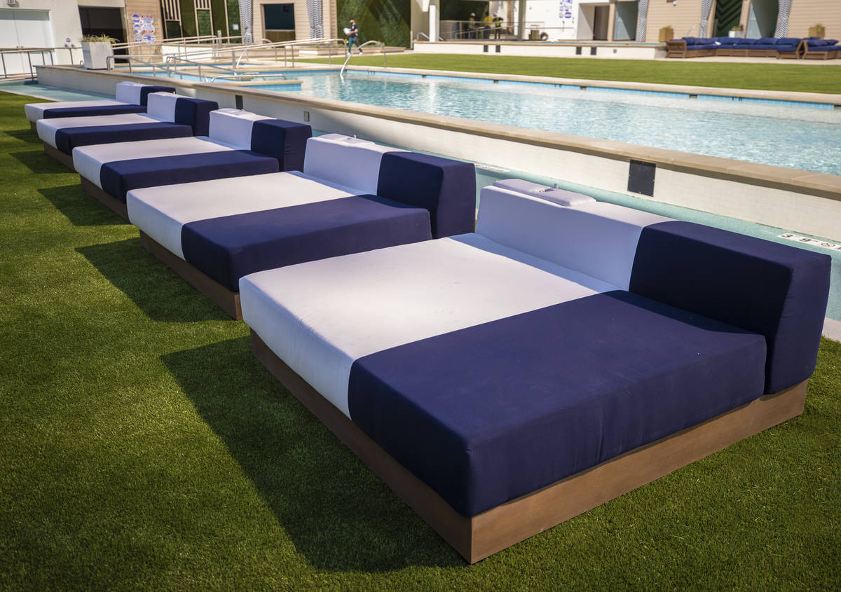 Once your eyes adjust, you can take in the entirety of the tiered complex. Six pools and two spas make up the 15,000 square feet of wet space. The 337 chaise lounges, 38 daybeds, 30 cabanas and super cabanas, eight poolside boxes and two swim-up bars add to Stadium Swim’s capacity of 4,000 guests.