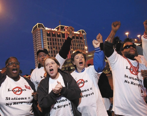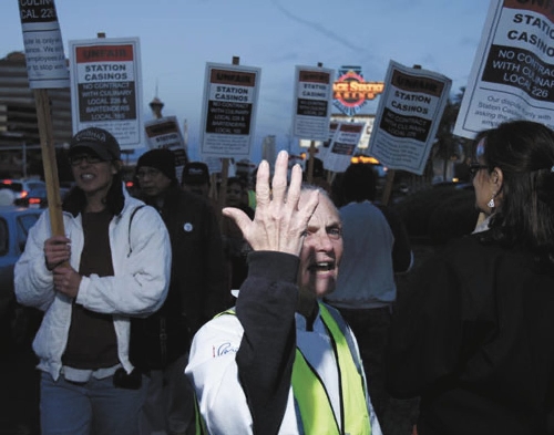 Metropolitan Police Capt. Larry Burns estimated that 750 Culinary workers from casinos in downtown Las Vegas and the Strip protested Thursday near Palace Station. For more than six hours, they marched along Sahara Avenue carrying signs that read, "Unfair Station Casinos" and chanting, "Stop the pressure, stop the lies, it's our right to unionize" and "Hey, hey, ho, ho, union busting's got to go."