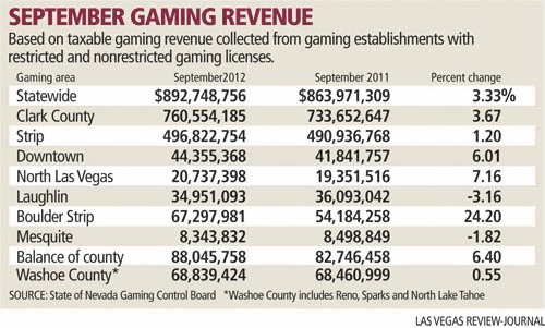 Statewide, casinos collected $892.7 million in gaming revenues in September, a 3.3 percent increase compared to the same month a year ago according to figures released Thursday by the Gaming Control Board.