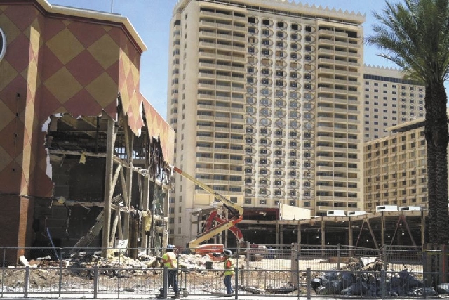 The work was just a small part of the ongoing renovation project, which also calls for stripping down and remodeling two of the property’s three hotel towers and demolishing a low-rise hotel building. The 1,620-room property is scheduled to reopen in fall 2014 as the SLS Las Vegas, a rebirth for a storied Strip resort that fell on hard times in the recession and finally closed in May 2011 after punishingly low room rates made it economically viable.