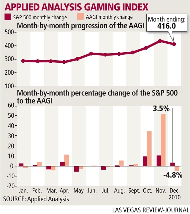 The improvements in casino company stocks helped push the Applied Analysis Gaming Index to a 45.4 percent increase over the past 12 months, growing from 286.18 in December 2009 to 416.00 in December 2010.