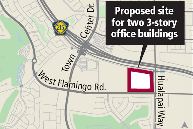 Howard Hughes executives recently filed plans with Clark County for two three-story office buildings at the northwest corner of Flamingo Road and Hualapai Way, in the southwest valley. The company, developer of Las Vegas’ largest master-planned community, owns the vacant 30.8-acre site.