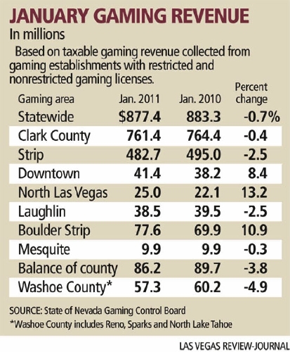 Statewide, casinos collected $877.4 million from gamblers, compared with $883.3 million collected in January 2010. The figures marked the fourth straight January that gaming revenues had declined from the previous year. Gaming revenues have also declined in three straight months starting in November.