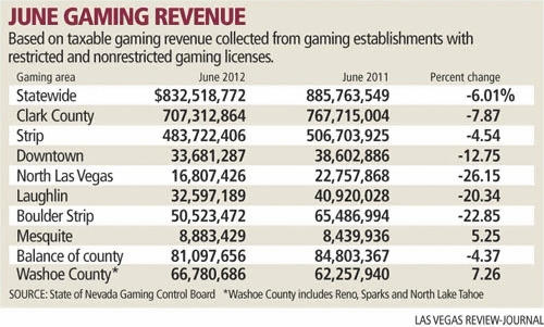 According to figures released Thursday by the Gaming Control Board, Nevada casinos collected $832.5 million from gamblers in June, compared with $885.8 million collected in June 2011.