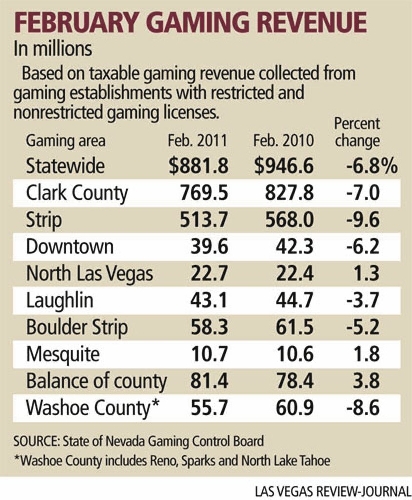Nevada casinos collected $881.8 million from gamblers in February, compared with $946.6 million collected in February 2010. The decline was the largest monthly dip in the past four months.