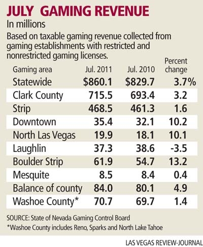 Statewide in July, casinos collected $860.1 million in gaming revenue, compared with $829.7 million a year ago. On the Strip, casinos reported $468.5 million, compared with $461.3 million in July 2010.