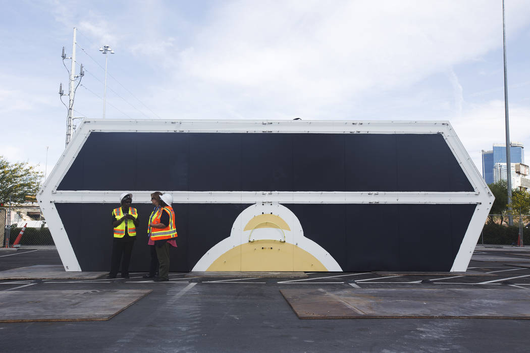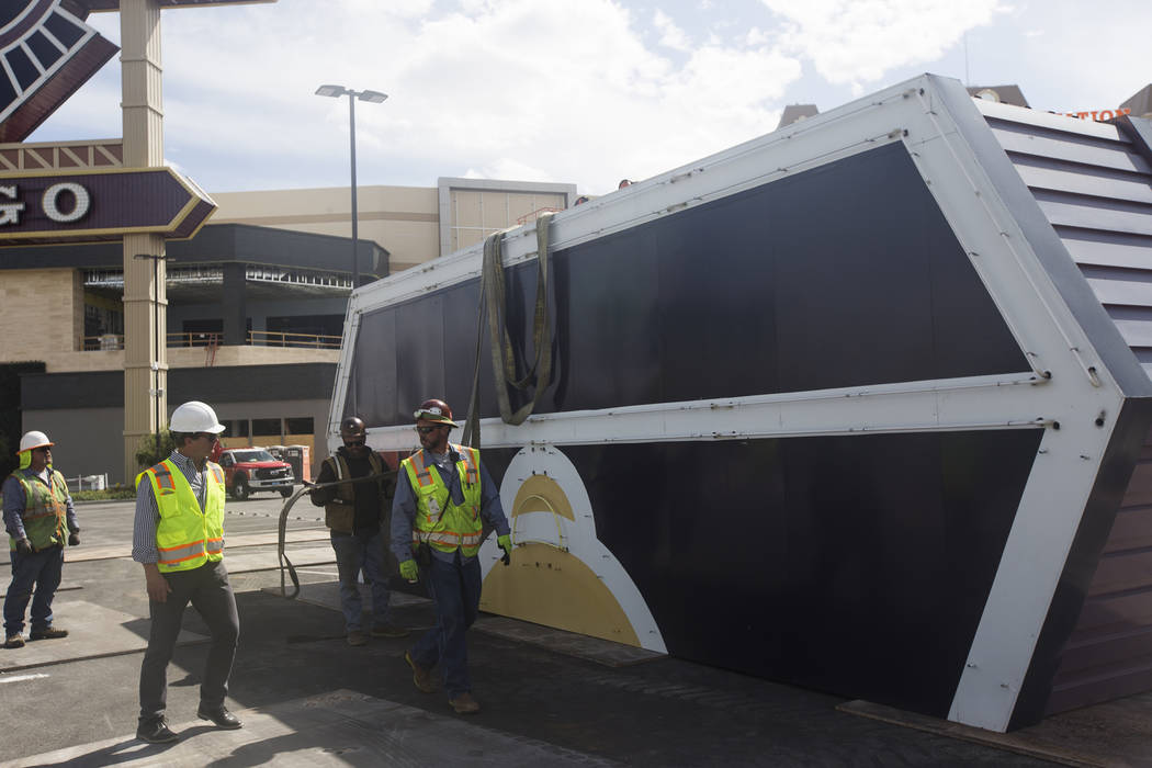 The first piece of the 126-by-126-foot Palace Station train marquee has left the Station.
