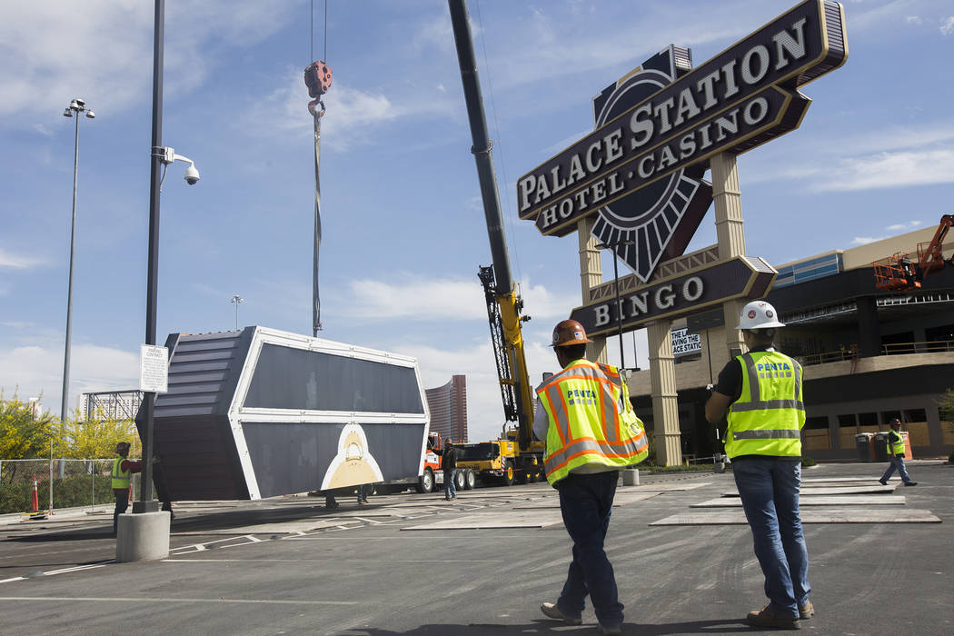 Workers prepare to remove the last piece of Palace Station’s iconic train theme, first unveiled in 1983, on Monday, April 30, 2018, in Las Vegas. The first piece of the marquee, an 11-foot-tall by 37-foot-wide smokestack, will be removed first by a hydro crane with the remainder of the marquee being dismantled over a two-week period. Bizuayehu Tesfaye/Las Vegas Review-Journal @bizutesfaye