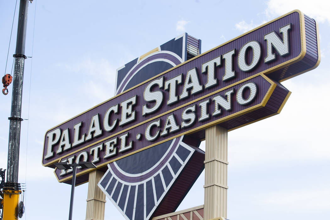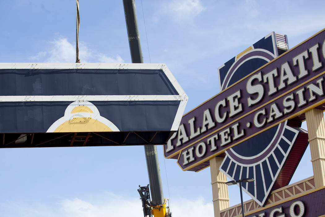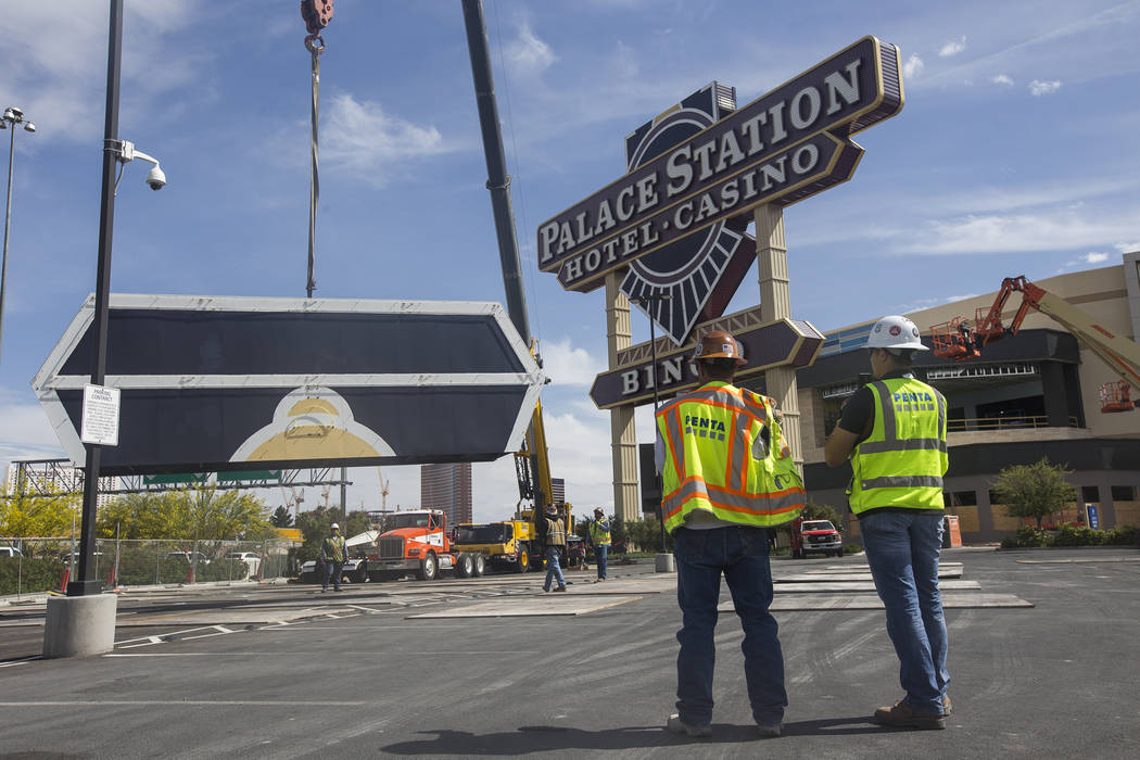 The top piece of Palace StationÕs train sign is dismantled in Las Vegas, Monday, April 30, 2018. The marquee is the final train-themed remnant of the Station Casinos’ first property. The hotel-casino is in the process of a $200 million renovation. Rachel Aston Las Vegas Review-Journal @rookie__rae