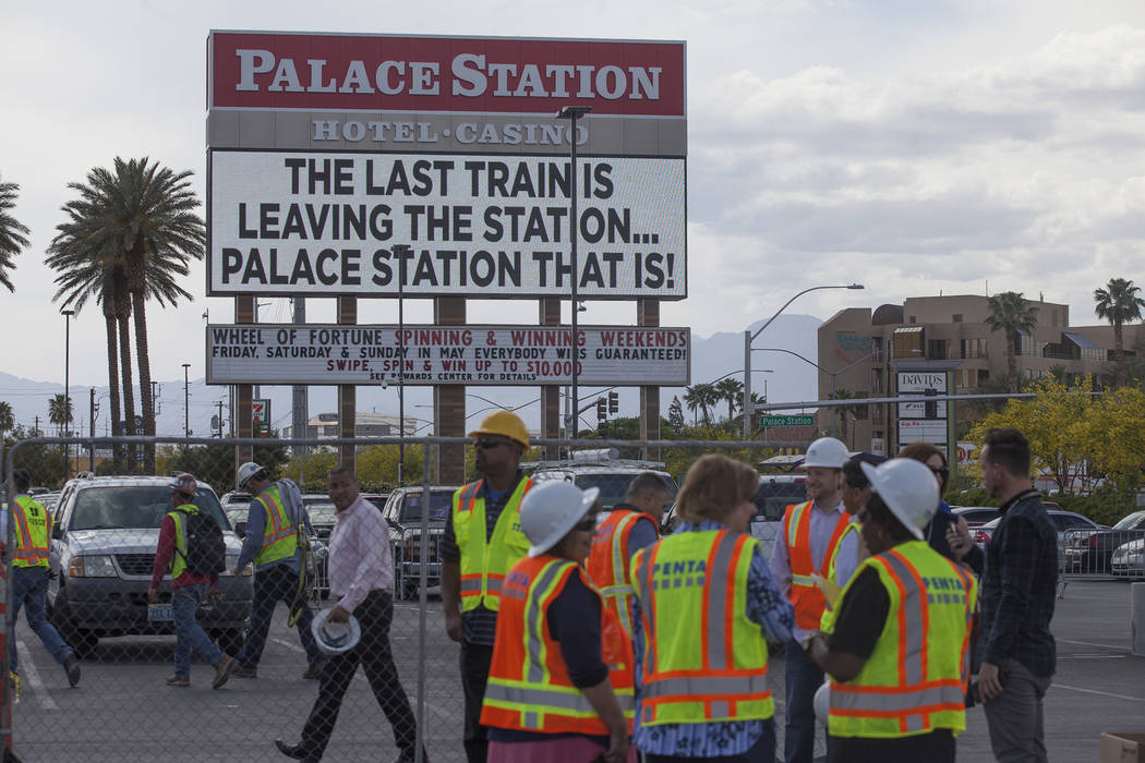 Workers and media leave the parking lot where the top piece of Palace StationÕs train sign rests in the parking lot in Las Vegas, Monday, April 30, 2018. The marquee is the final train-themed remnant of the Station Casinos’ first property. The hotel-casino is in the process of a $200 million renovation. Rachel Aston Las Vegas Review-Journal @rookie__rae