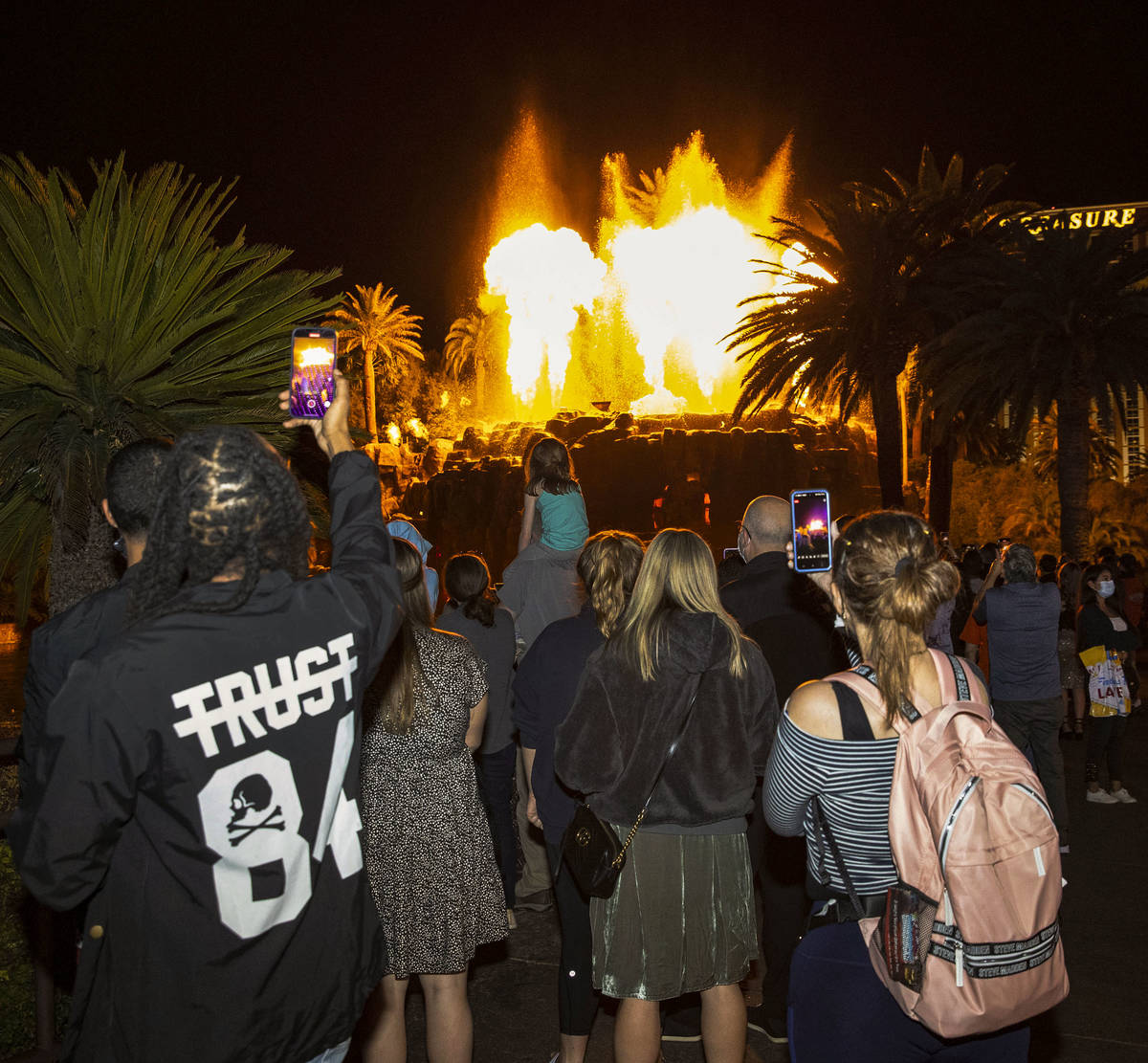 Nearby, a woman in a black sash with golden letters danced to the 8 p.m. Mirage volcano pyrotechnics show and was overheard quoting a Disney Pixar movie: “They initiate him in the volcano and then they’re like, ‘Shark bait, hoo ha ha!’”