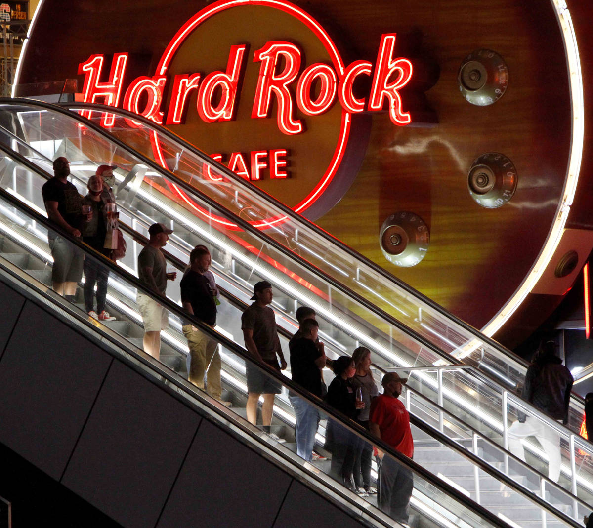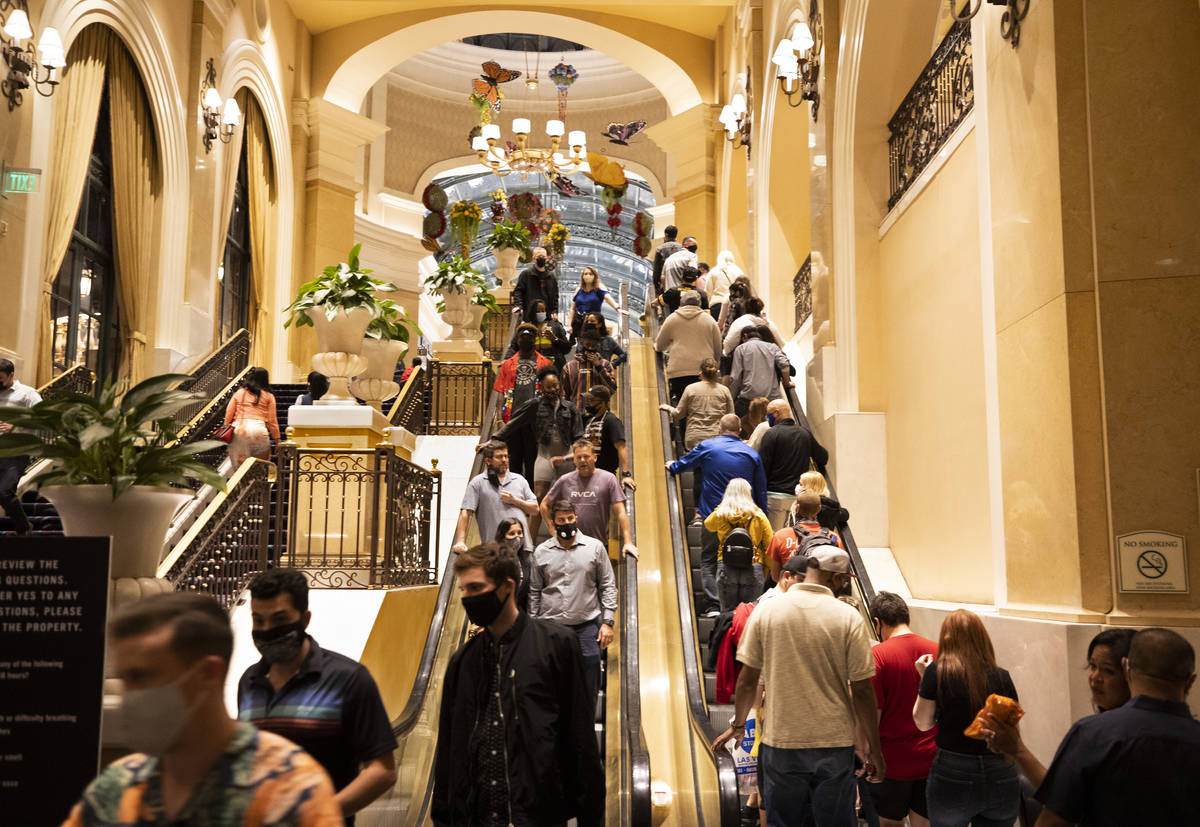 Farther south, a man with his mask pulled down, riding the escalator up to an elevated walkway into Bellagio, surveyed the crowd of people on Las Vegas Boulevard and commented to a friend.