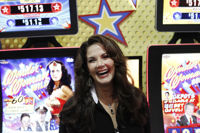 Actress Lynda Carter — Wonder Woman from the 1970s TV show — spent a few hours in the Bally Technologies booth signing autographs and posing for photos next to the slot machine that bears her likeness.