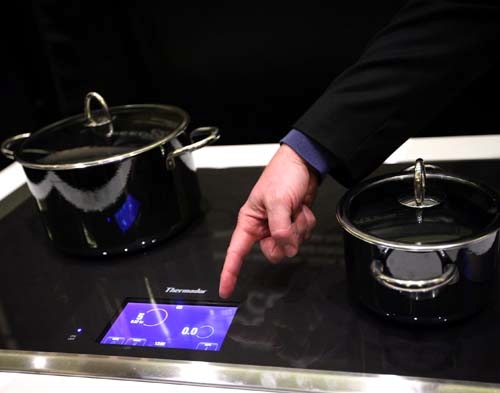 Thermador was demonstrating a full-surface induction appliance with natural mapping user interface -- or, in layman's terms, a smart cooktop stove -- at CES Unveiled. Instead of traditional stovetop burners, the cooktop's glossy black surface has computers that sense where pots and plans are placed. The next-gen stove can be yours in July for $4,949.