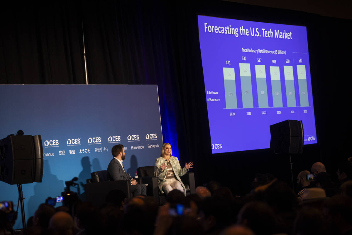 Prior to the opening, Brian Comiskey, senior director of innovation and trends for the Consumer Technology Association, and Melissa Harrison, vice present of marketing and communication, discussed technology trends to a standing-room-only crowd.