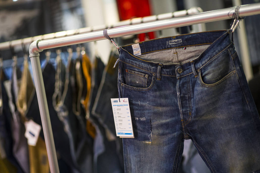 “This is a garment that has been finished with just one glass of water,” Penades says proudly, holding up a pair of jeans from a rack in his booth.