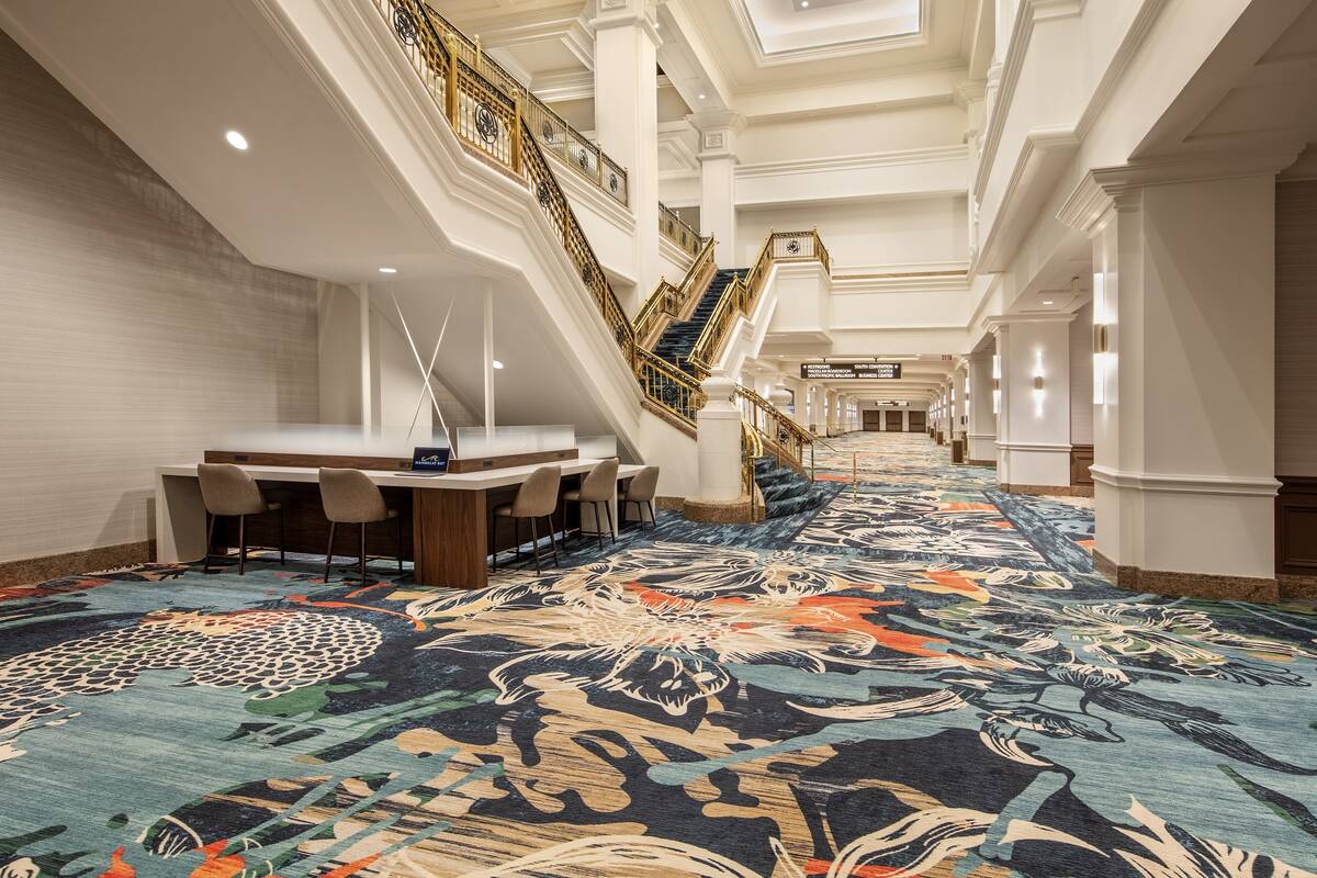 The interior of the Mandalay Bay Convention Center was updated to a tropical theme with white-washed walls and ceilings along with floral designs in cerulean and coral colors and walnut accent walls. Other updates include streamlined signage, enhanced lighting and new seating areas.