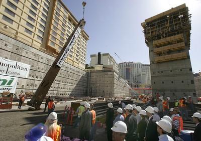 After a year of digging down, construction on the Cosmopolitan began its ascent skyward Monday with the placement of its first 50-foot high steel beam.