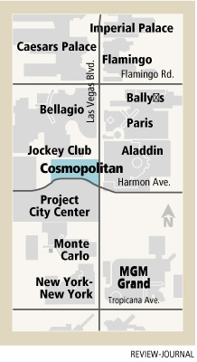 The 8-acre construction site is wedged between the MGM Mirage’s Project CityCenter to the south and west and Bellagio to the north. The Jockey Club shares the borders with the Cosmopolitan site on the north.