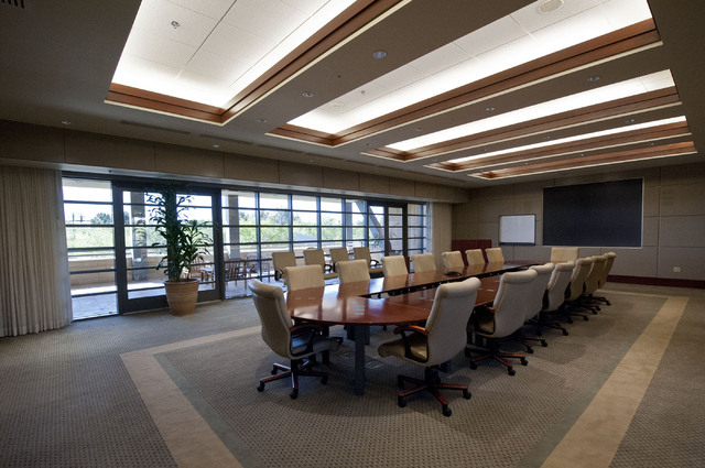 There are also two kitchens, an executive dining room and a workout room with showers and lockers. C-level executive offices each have en-suite bathrooms, and a private courtyard has a fountain. Finishes include stone floors, custom woodwork, trellis-covered walkways with wisteria and exterior cladding of sandstone, granite, steel and glass. It has a prime suburban location across the street from the TPC Summerlin golf course and the upscale Eagle Hills and Tournament Hills neighborhoods. An adjacent acre could accommodate another office building of up to 20,000 square feet.