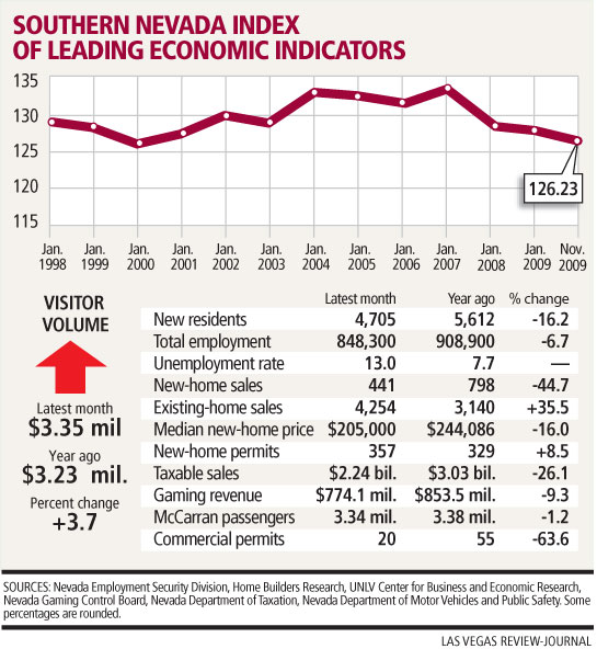 All of the index categories are tied to jobs, from gasoline sales and taxable sales to visitor volume and convention attendance, Potts said. Employment declined 6.7 percent in October to 848,300 and the unemployment rate rose to 13 percent, compared with 7.7 percent a year ago.