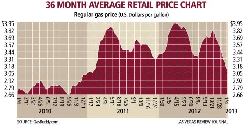 In recent days, a handful of Las Vegas stations have cut their prices below $3 a gallon, crashing through that level for the first time in two years. In October, according to surveys conducted by GasBuddy.com, the average shot up to $3.82 after hitting $3.95 in April, the highest since the $4-plus records set in 2008.