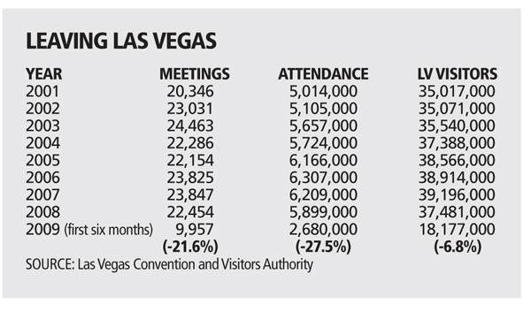 Traffic began to stall in 2007, even as tourists continued to arrive in record numbers, and has plunged this year. Through the first six months of this year, the 9,957 meetings held were 21.6 percent fewer than in 2008 and attendance was down 27.5 percent to 2.7 million, even as the overall visitor count was down only 6.8 percent.
