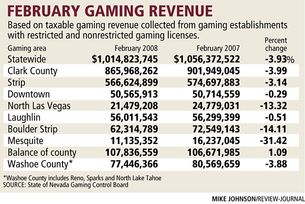 However, gaming analysts said the locals market fell more than 6 percent in February when results from the Boulder Strip (down 14 percent) and North Las Vegas (off 13.3 percent) were factored in.
