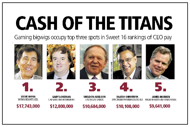 In coming up with the annual Sweet 16 of CEO compensation, the Las Vegas Review-Journal followed the calculations prescribed by the Securities and Exchange Commission for the proxy statements that announce annual meetings. By that standard, Steve Wynn of Wynn Resorts Ltd. led the pack at $17.7 million.