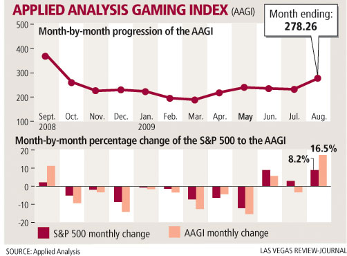 A gaming industry index compiled by Applied Analysis jumped more than 39 points in August to about 278 and recorded its highest values since September 2008, a month before the financial meltdown.