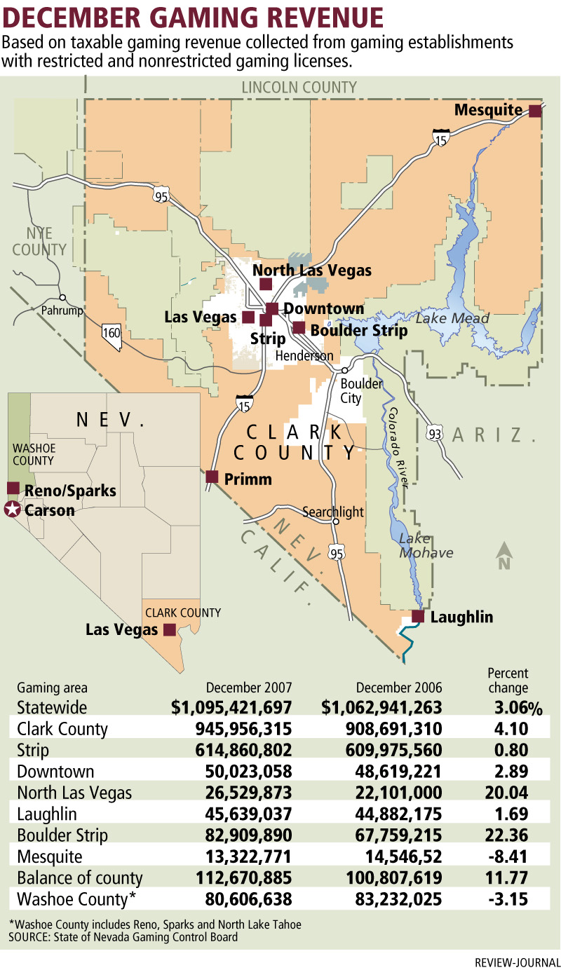 December's gaming win gave Nevada a boost to close out the year. Casinos won $1.095 billion during the month, a 3.06 percent increase compared with $1.062 billion won in December 2006. On the Strip, casinos won $614.8 million, a less-than 1 percent increase compared with $609.9 million won the year before.