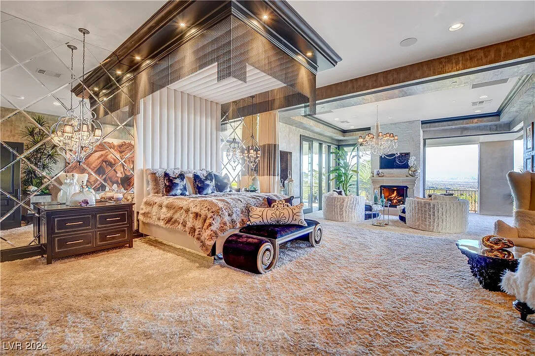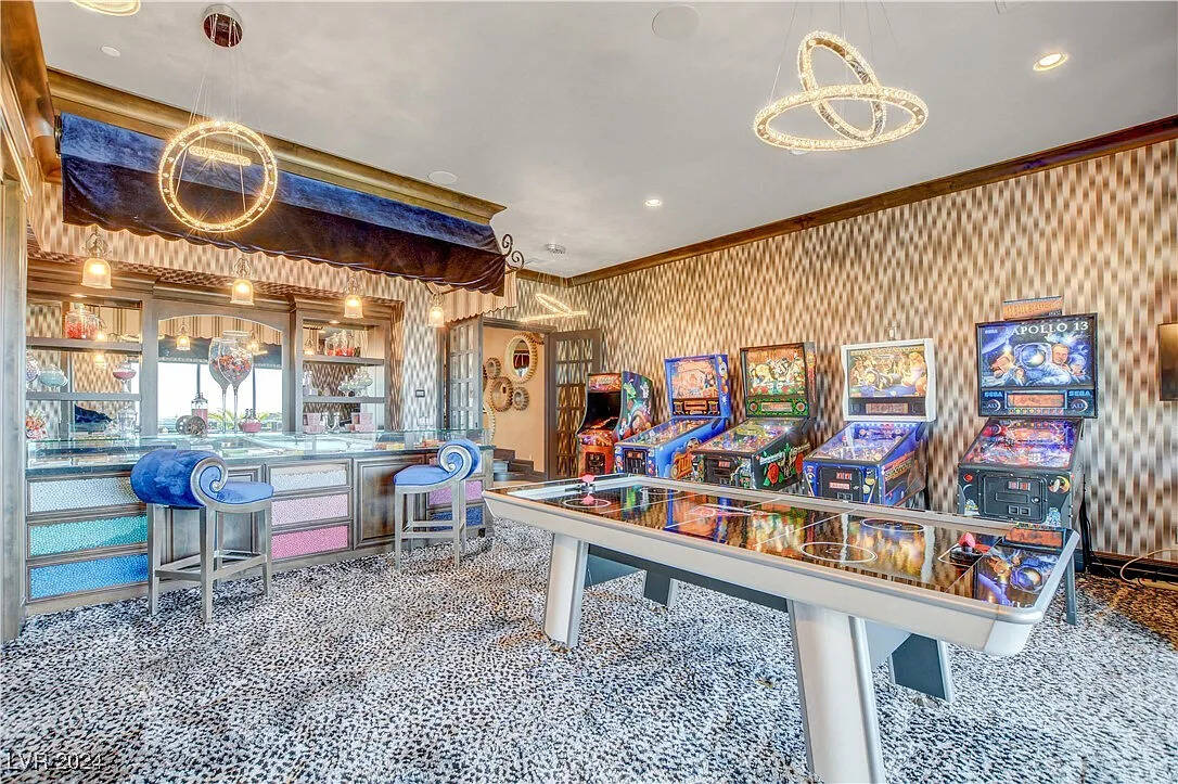The amenities don’t stop there, there is also: a wellness wing with a massage, steam and sauna room, indoor hot tub and a gym that leads to a waterfall; two home offices; a game room and movie theater room with a custom candy bar; and a seven-car garage.