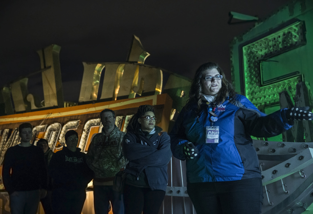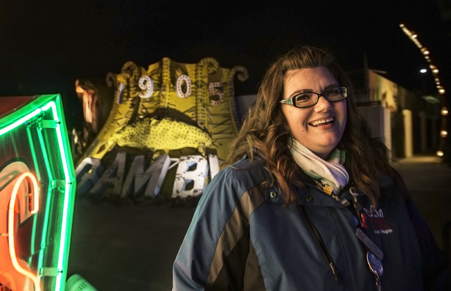 Canelon works up to 70 hours a week, sharing her time between the Mob Museum, where she works full time giving tours and doing outreach, and the Neon Museum, where she works work part time guiding tours.