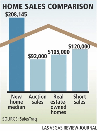 The gap between new and existing median home prices in Las Vegas has widened to nearly $100,000, the largest it has ever been. The new home median for January was $208,145, compared with $92,000 for auction sales, $105,000 for real estate-owned homes and $120,000 for short sales, Las Vegas-based Sales- Traq reported.