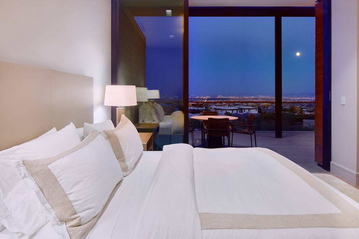 Located, yet again, in MacDonald Highlands, this newly built estate is a single story with five beds and seven baths. Finished with bright cream finishes, and 70 natural marble slabs. Inside, residents can enjoy a home gym with a sauna and a full kitchen, including a butler and casita kitchen. Outside, a 65-foot infinity pool offers views of the Strip and Dragon Ridge Golf Course. There’s also a Jacuzzi, two firepits, built-in backyard patio heating and barbecue.