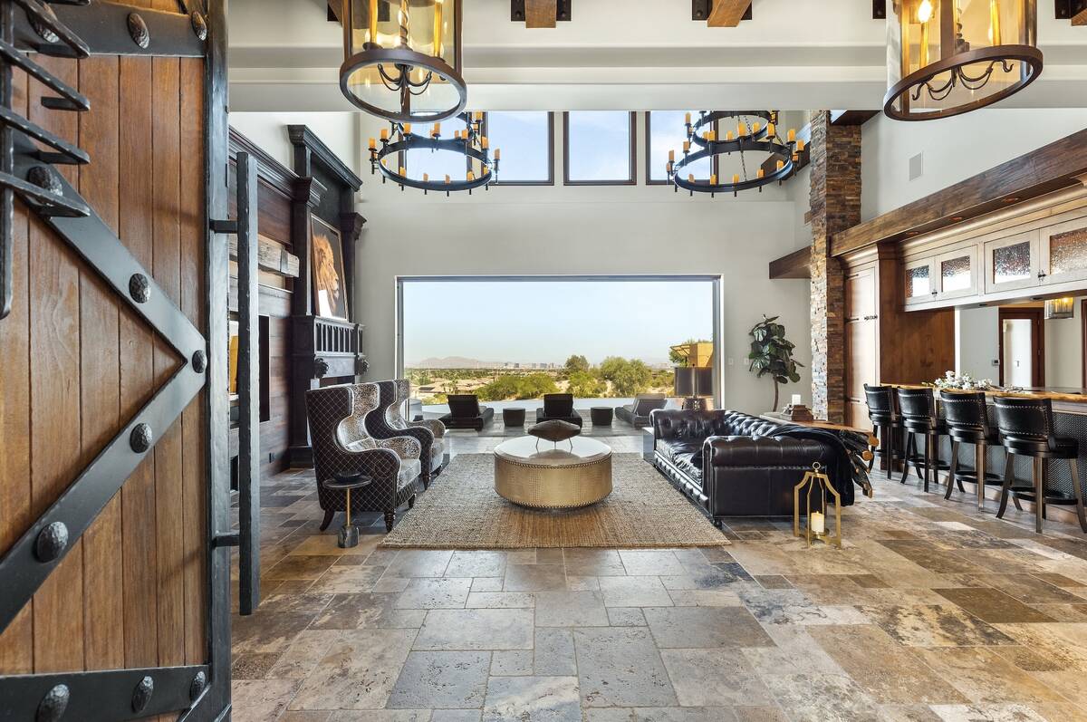 Located in the luxury community The Pointe in The Ridges, this estate offers maximum comfort and security behind triple guard gates. The three story, 10,591-square-foot mansion offers six bedrooms, 10 bathrooms and a four-car garage. Both the exterior and interior are finished with dark woods, desert rock details and wagon wheel farmhouse chandeliers. Special features include a theater, 20-foot pocketing glass doors, lounge with a full bar, chef’s kitchen and prep kitchen, as well as a home automation system.