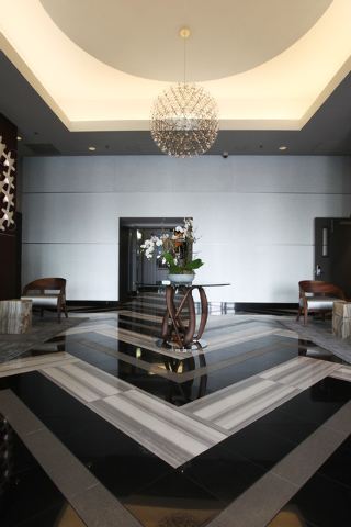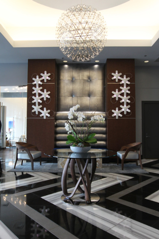 Illuminated planters from Italy are arriving soon for the front entrance, while residents walk on a new tiled lobby floor made of marble, porcelain and granite. The lobby also includes glass bead wallpaper and sitting areas with silver embossed leather back rests and navy blue, mohair-covered seating.