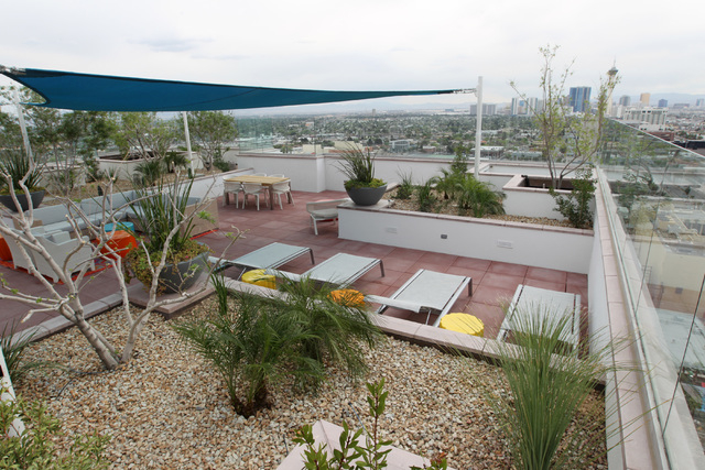 The rooftop includes a shade structure that is able to withstand winds of 120 mph, a cooking area with a grill and wine cooler, new lounge chairs and table, and a desert landscape theme.