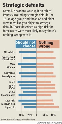 Nevada homeowners are equally divided over the ethics of "strategic default" or not paying their mortgage even though they can afford to, a report released Thursday by the Nevada Association of Realtors shows.