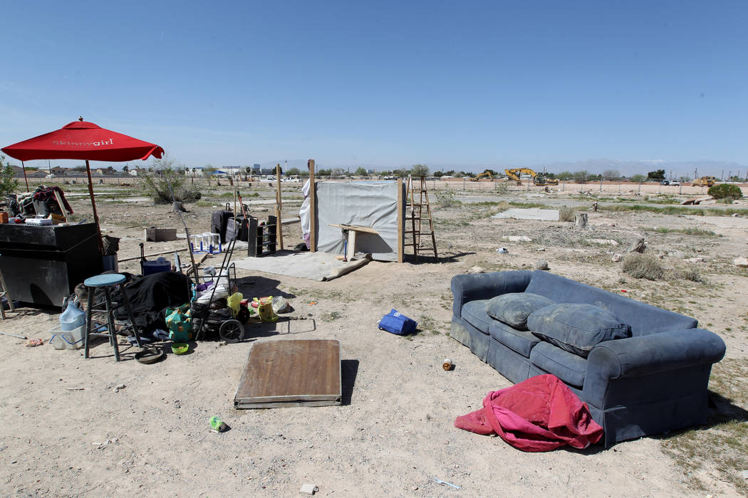 A homeless camp next to the northeast valley project site has a motor home, shopping carts, tents, a couch and other items scattered about. There’s even a makeshift kitchen of sorts, with a stocked pantry, cookware and a small table.