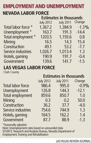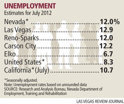 The only solace comes in comparing July's numbers with figures from a year ago, Brown said. The July 2011 jobless rate was 13.8 percent in Nevada, and a record 14.5 percent in Las Vegas.