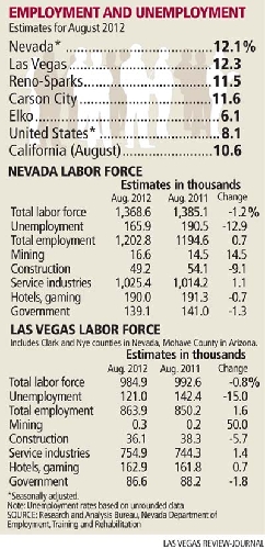 Nevada’s unemployment rate was 12.1 percent in August, up from 12 percent in July, the state Department of Employment, Training and Rehabilitation reported Friday. In Las Vegas, joblessness dropped from 12.9 percent to 12.3 percent, though the employment department doesn’t seasonally adjust local rates. That means they can be more volatile than state unemployment.