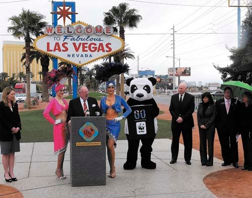 Las Vegas Mayor Oscar Goodman and Clark County Commissioner Larry Brown attended the event, held underneath the "Welcome to Fabulous Las Vegas" sign at the Strip's south end.