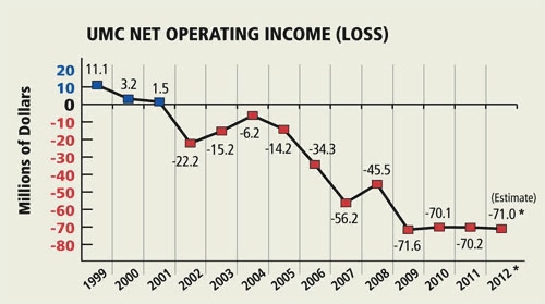 The expense of running UMC has dropped in the past couple of years, as patient loads have dropped. In fiscal 2011, which ended June 30, the expense fell 3.7 percent.