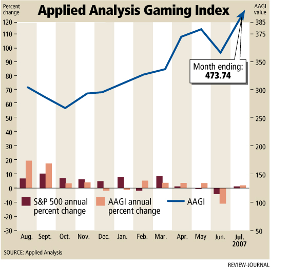 The average daily share prices of six of the nine casino operators and slot makers tracked for an index by Las Vegas-based Applied Analysis fell when comparing their values in July with those in June.