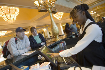 Edward Kozlovsky and his girlfriend, Jenia Cozub of Hackensack, N.J., stay at a different Strip hotel-casino every year. Kozlovsky checked with hotel officials earlier in the week on his reservations.