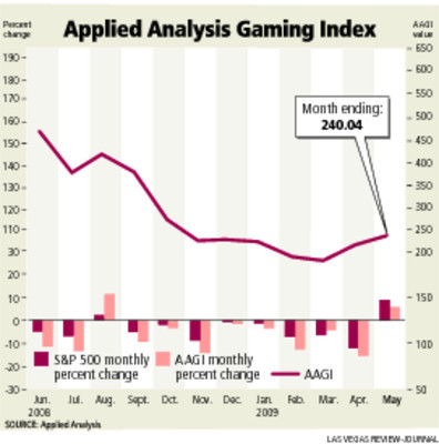 The positive month for gaming stocks helped boost the Applied Analysis Gaming Index 20.5 points to 240.04, the second straight monthly increase. April's 30-point jump marked the first month the gaming index rose since December.